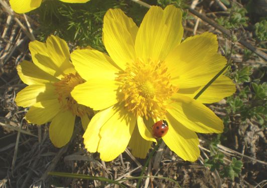 Адонис весенний (горицвет, черногорка) - Adonis vernalis L. (семейство Лютиковые) - это многолетнее травянистое растение до 10—40 см высотой. С корня вырастают несколько стеблей, некоторые из них не цветоносны. Стебли возле основы покрыты бурыми листками в виде чешуи. Цветы ярко-желтые, большие, до 6 см в поперечнике, венчают цветоносные стебли и их ответвления, снизу буроватые, чашечка их пушистая, в венчике 15-20 лепестков, они продолговатые, зубчатые. Плод состоит из 30—40 орешков. Существует несколько видов адониса. Цветет с ранней весны до половины мая.