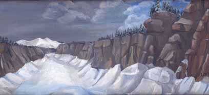 Рис. Л.Харкевича (масло). Каменный каньон р. Косью. Замерзший по осени лед осел на камнях, и река выглядит вздутой.