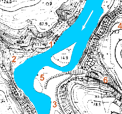 Острів Клепаний (Гардовий) Це скелястий останець, що неглибокою промоїною, яка під час повеней служила протокою, поділяється на дві половини. По обидва боки від неї розташована низинна частина острова, замулена алювіальними відкладами піску і поросла травою, чагарником та деревами. За переказами місцевих жителів, тут росли столітні дуби, які були вирубані в 1920 - 1930-х роках. Далі на південь і північ розташовані скелясті частини острова. Проміжки між гранітними брилами також заповнені відкладами алювіального піску, які утворюють тут невеликі задерновані площадки. ![]() Схема о-ва Клепаний 1942 р.